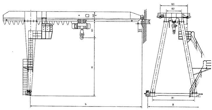 MHB型電動葫蘆半門式起重機與CD1(單速)、MD1(雙速)型電動葫蘆配套使用,是一種有軌運行的中小型起重機。一端在承重梁上行走,一端在地面軌道上行走。
