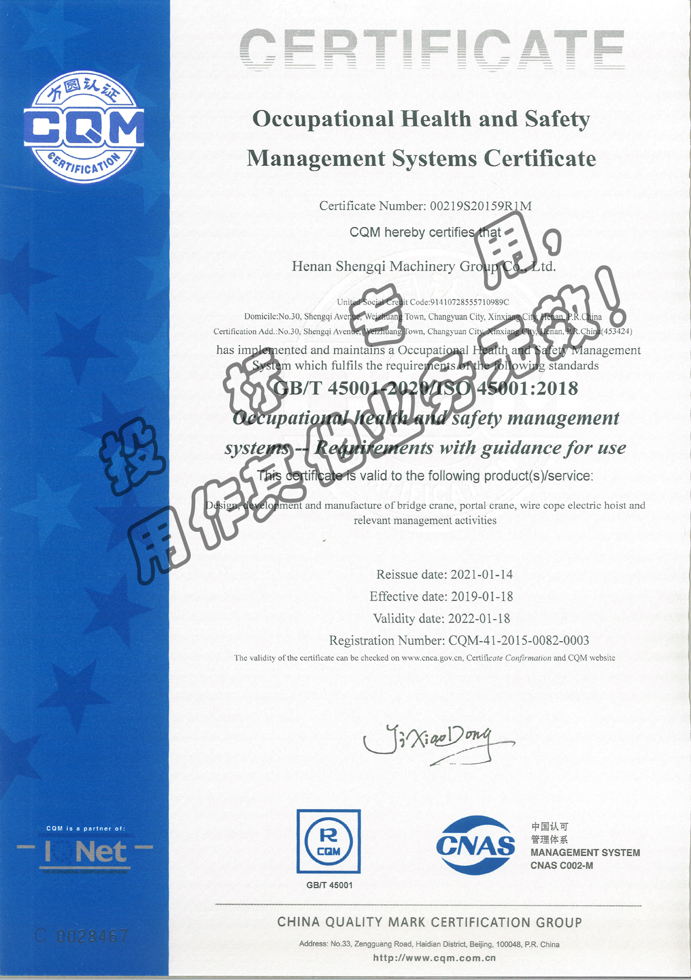 » 職業健康安全管理體系認證證書