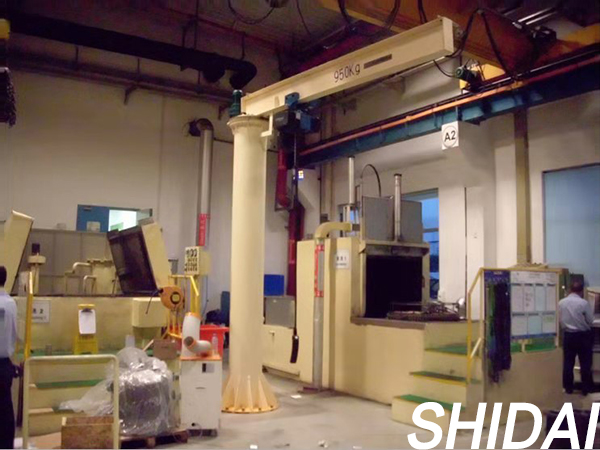 BZZ-HZ輕型旋臂起重機 它由立柱、變截面臂、回轉支承驅動裝置和電動葫蘆或卷揚機組成。旋臂起重機通過底座地腳螺栓固定在混凝土基礎上,由電機帶動減速機齒輪與回轉支承嚙合驅動懸臂回轉,電動葫蘆或卷揚機在封箱臂鋼梁上作往返運行作業。