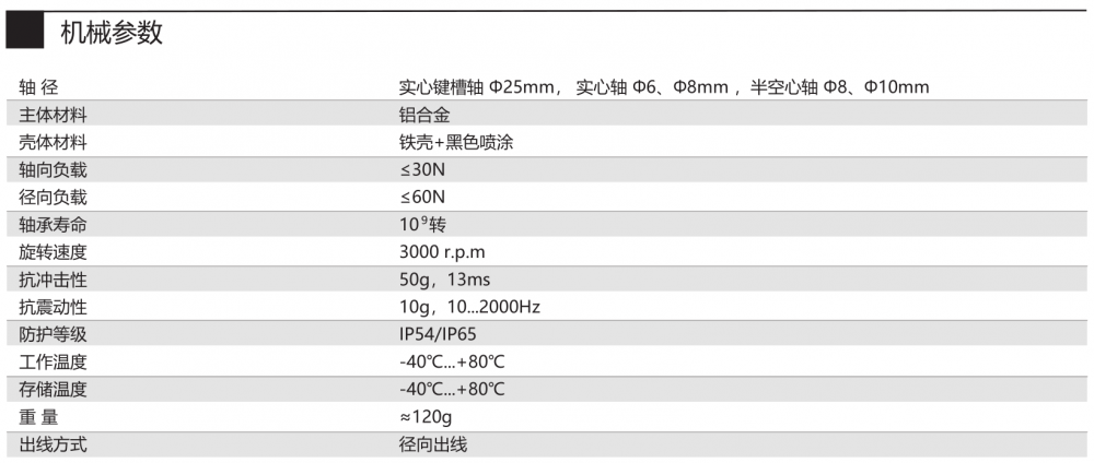 感應(yīng)原理 磁性 功能原理 多圈 多圈技術(shù) 機械齒輪組(無需電池) 外徑 Φ50mm 軸徑 實心鍵槽軸 Φ25 mm,實心軸 Φ6、Φ8mm 半空心軸 Φ8、Φ10mm 分辨率 22Bit 每圈步數(shù) 4096/12Bit 圈數(shù) 1024/10Bit 接口 CANopen 工作電壓 DC5V、DC10-30V 防護等級 IP54、IP65