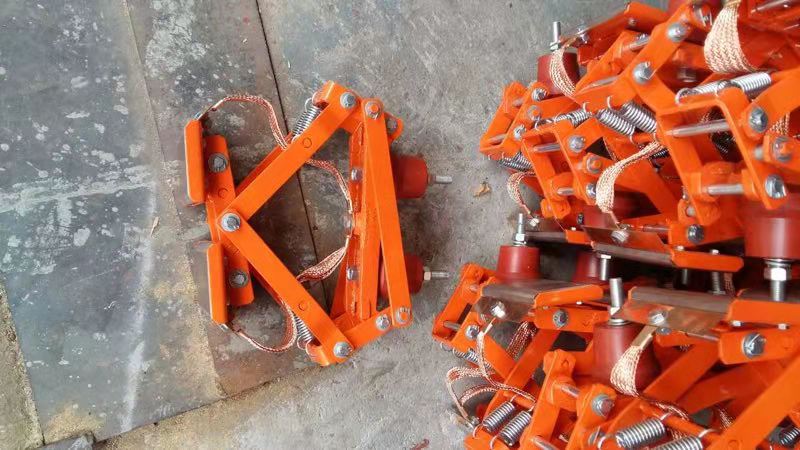 機(jī)械結(jié)構(gòu)的張力裝置決定集電刷與導(dǎo)軌的滑動接觸壓力和機(jī)構(gòu)的穩(wěn)定性,集電刷則是導(dǎo)軌滑動接觸拾取電能的導(dǎo)體,它的性能和導(dǎo)電質(zhì)量以及材料結(jié)構(gòu)成分的優(yōu)劣,將直接影響整個(gè)系統(tǒng)設(shè)備的安全運(yùn)行質(zhì)量。
