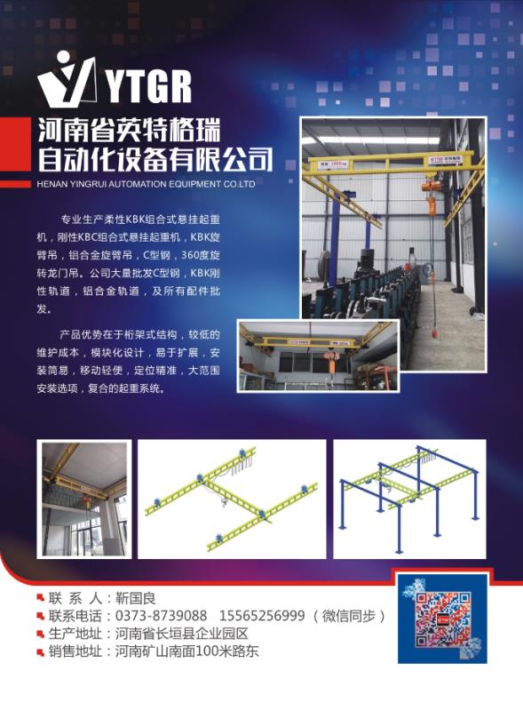 :專業(yè)生產(chǎn)柔性KBK組合式懸掛起重機,剛性KBC組合式懸掛起重機,KBK旋臂吊,鋁合金旋臂吊,C型鋼,360度旋轉(zhuǎn)龍門吊。我公司的優(yōu)勢在于桁架式結(jié)構(gòu),較低的維護成本,模塊化設(shè)計,易于擴展,安裝簡易,移動輕便,
