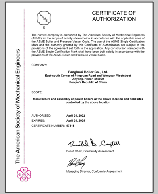ASME是“美國機(jī)械工程師協(xié)會(huì)”的簡稱,主要致力于機(jī)械行業(yè)相關(guān)標(biāo)準(zhǔn)的制訂,是具有很高權(quán)威性和影響力的國際性學(xué)術(shù)組織。ASME標(biāo)準(zhǔn)也是世界上最早、最具權(quán)威性的鍋爐及壓力容器規(guī)范。ASME認(rèn)證是方快鍋爐走向國際市場的必由之路,為方快產(chǎn)品進(jìn)入國際市場提供一份含金量較高的“通行證”。
