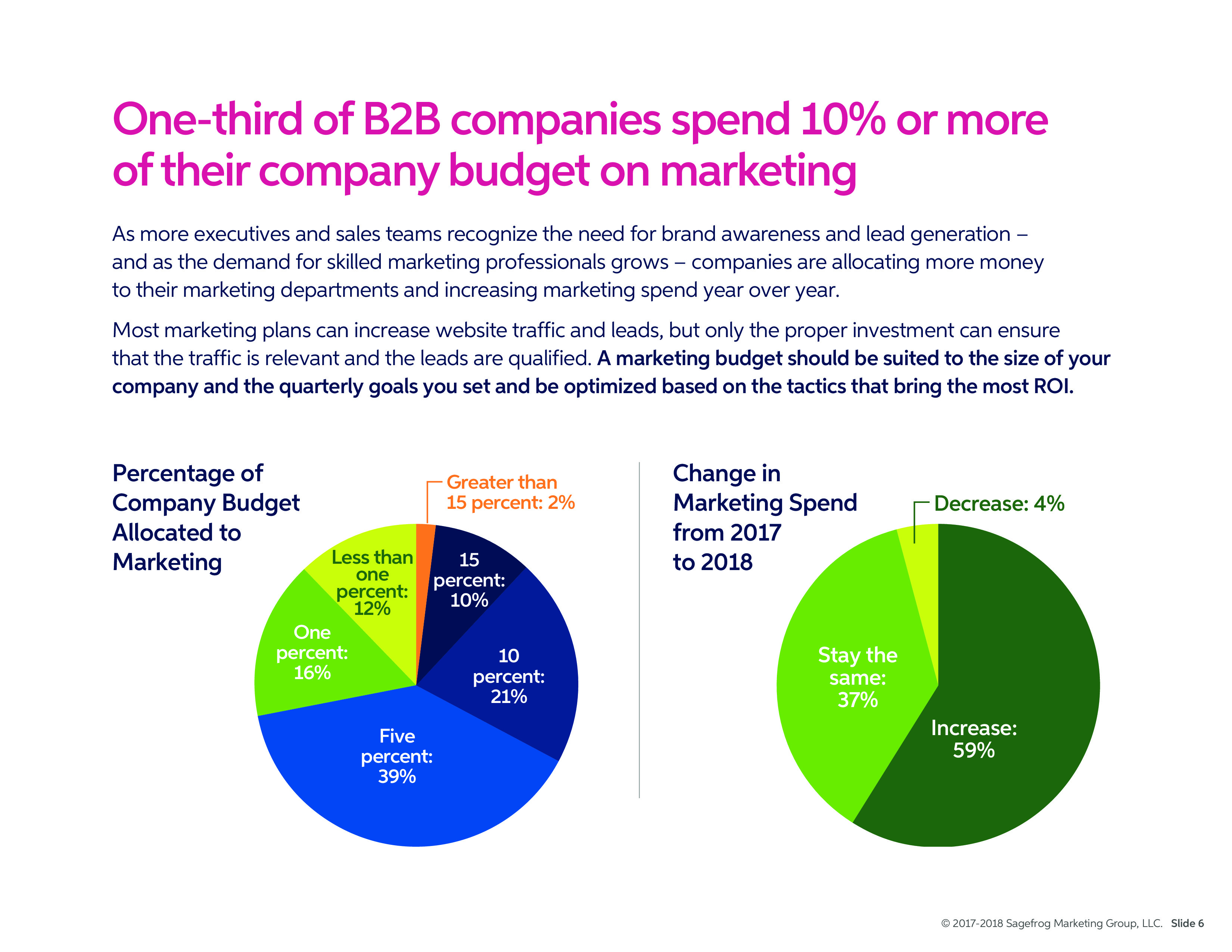 隨著越來越多的高管和銷售團隊認識到品牌意識和潛在客戶的需求,公司正在給營銷部門分配更多的預算,營銷預算逐年增長。但是,營銷預算應該適合公司的規模和季度目標,并根據帶來最高投資回報的策略進行優化。