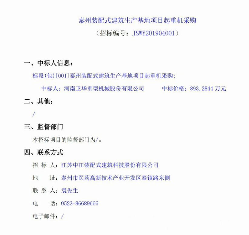 移動版:泰州裝配式建筑生產(chǎn)基地項(xiàng)目起重機(jī)采購中標(biāo)公告