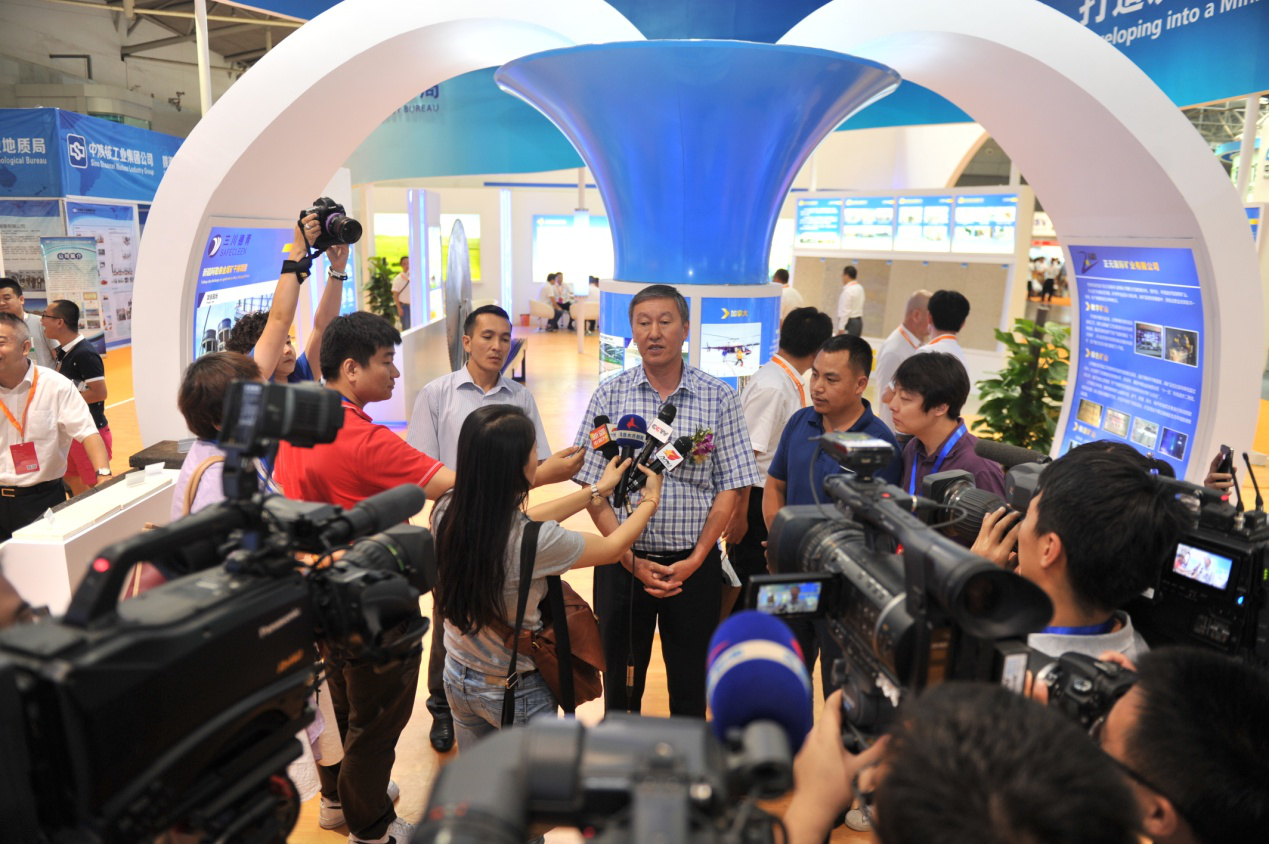 吉爾吉斯共和國地質(zhì)礦產(chǎn)資源蜀國務(wù)秘書蘇坦諾夫在礦博會會場接受媒體采訪