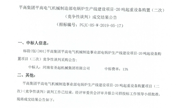 平高集團平高電氣機械制造部電鍋爐生產(chǎn)線建設項目-20噸起重設備購置(二次)(競爭性談判)成交結(jié)果公告