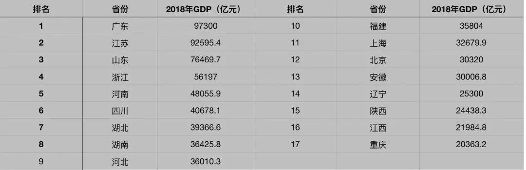 據數據顯示,2018年全國GDP十強省份分別為:廣東(9.73萬億)、江蘇(9.26萬億)、山東(7.65萬億)、浙江(5.62萬億)、河南(4.8萬億)、四川(4.07萬億)、湖北(3.94萬億)、湖南(3.64萬億)、河北(3.6萬億)、福建(3.58萬億)。而這些省市大多屬于中國的一二線城市群。