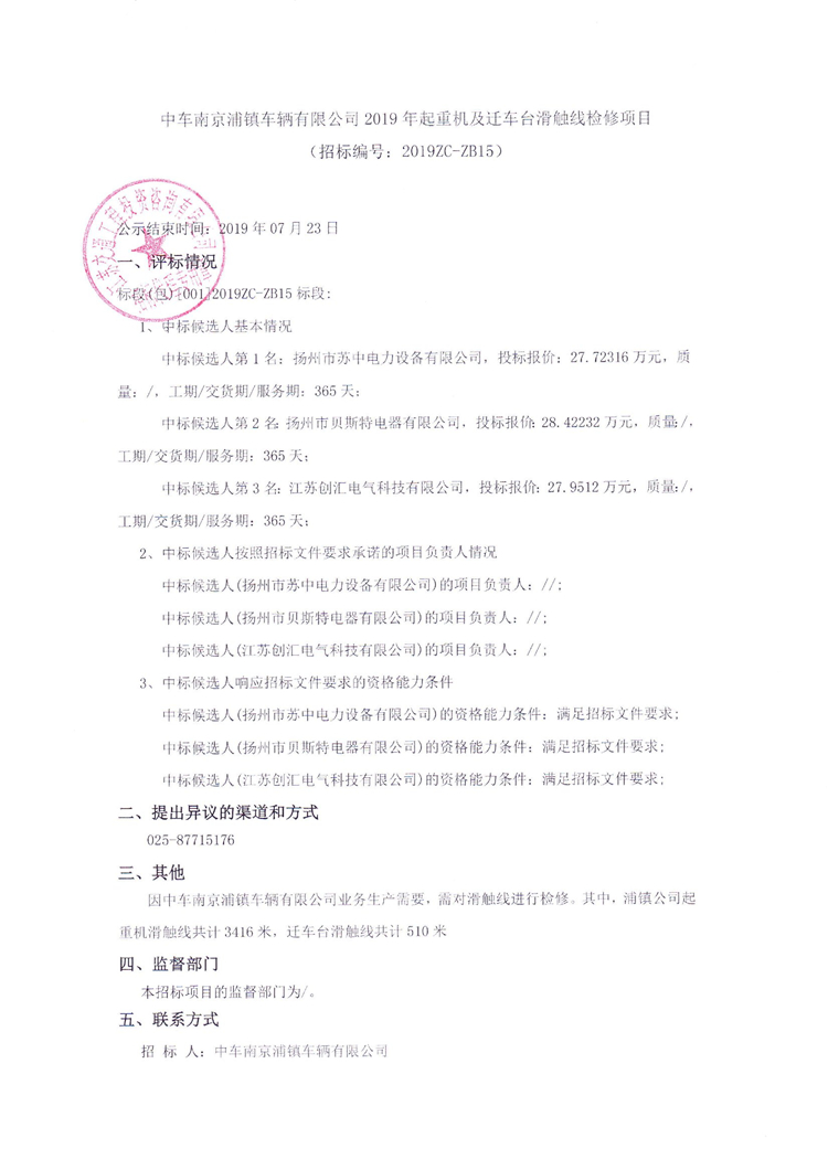 中車南京浦鎮(zhèn)車輛有限公司2019年起重機(jī)及遷車臺(tái)滑觸線檢修項(xiàng)目中標(biāo)候選人公示