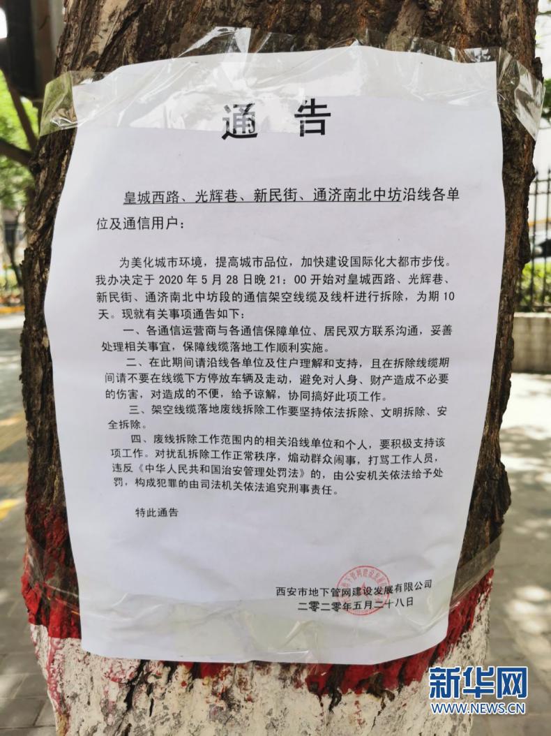 省政府周邊路段拆除架空線纜及線桿通告。新華網發