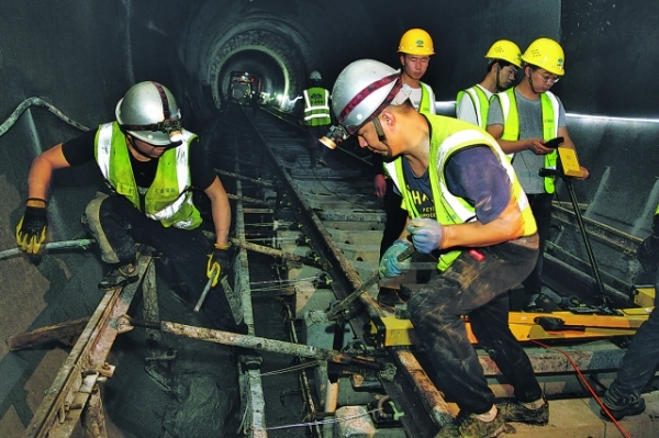圖為工人在富源北路站——森林公園站區(qū)間內(nèi),為軌道混凝土澆筑作模板支護(hù)準(zhǔn)備。記者 周永 攝