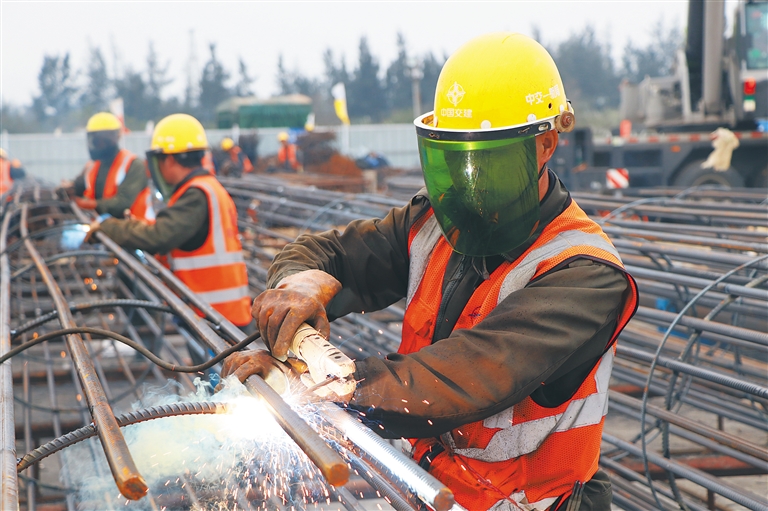 1月10日下午,在??诮瓥|新區高品質飲用水水廠項目工地,工人在一起焊接鋼筋籠。 通訊員 郝尉淞 攝
