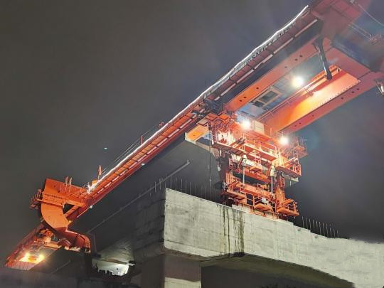 在1號梁場工點,中國電建項目部每天箱梁預制最高達4榀,“五一”期間完成箱梁架設4榀。在各連續梁工點,懸臂節段施工“加速度“,立模、扎筋、預應力管道安裝、混凝土澆筑等各道工序緊張有序進行。