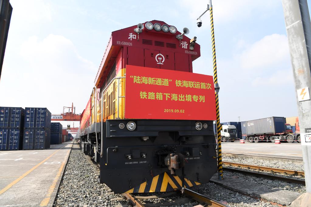 2019年9月2日,“陸海新通道”鐵海聯(lián)運(yùn)首次鐵路箱下海出境專列整裝待發(fā)。新華社記者唐奕 攝