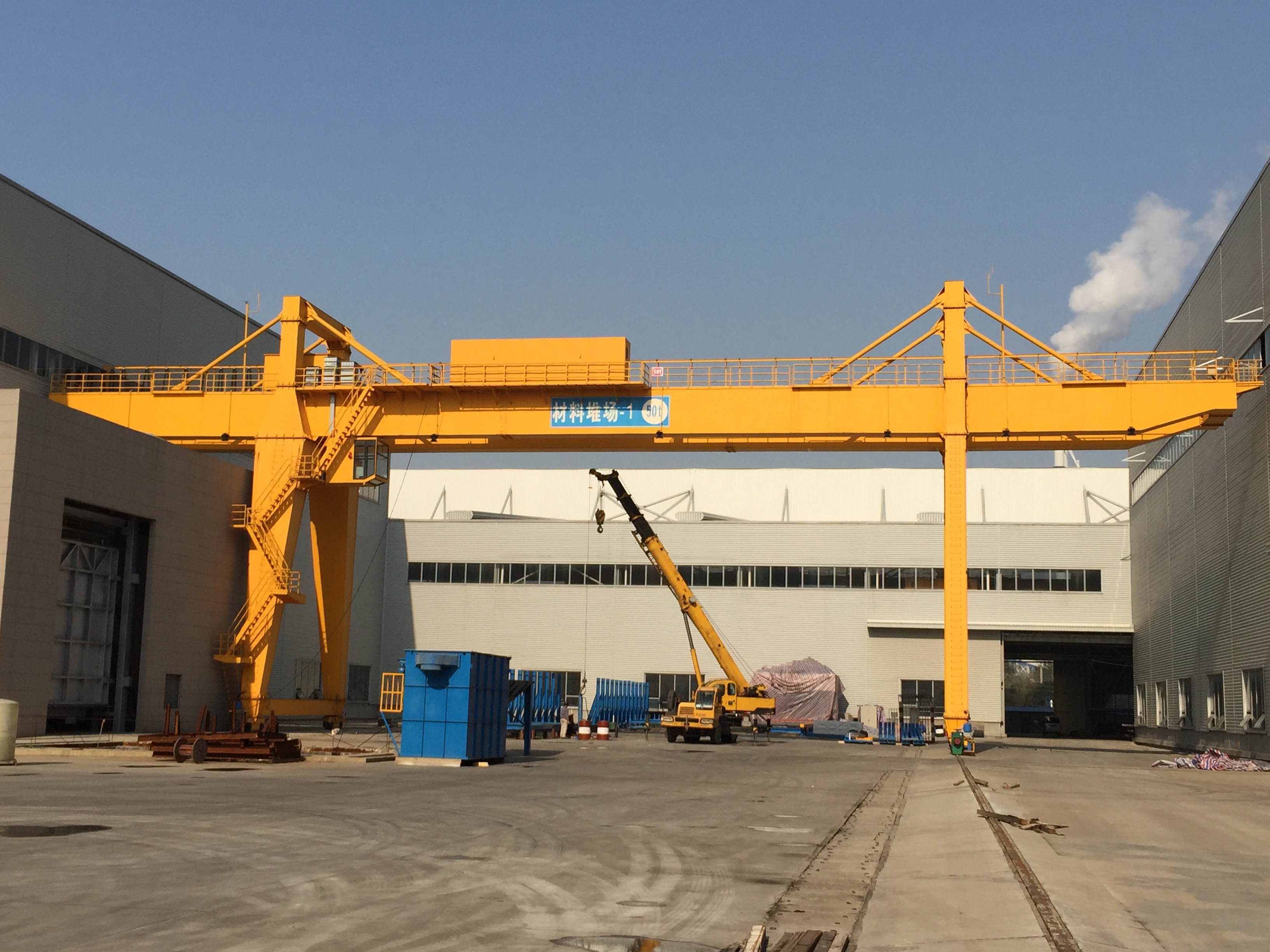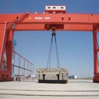 門式起重機是橋式起重機的一種變形。主要用于室外的貨場、料場貨、散貨的裝卸作業。它的金屬結構像門形框架,承載主梁下安裝兩條支腳,可以直接在地面的軌道上行走,主梁兩端可以具有外伸懸臂梁。門式起重機具有場地利用率高、作業范圍大、適應面廣、通用性強等特點,在港口貨場得到廣泛使用。