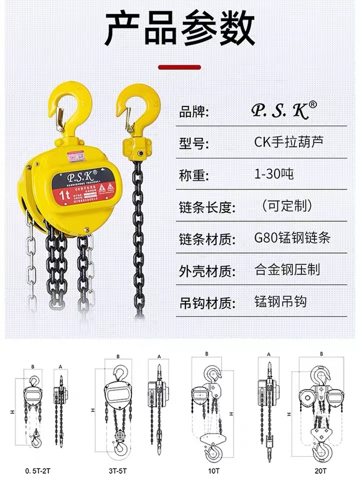 手拉葫蘆又叫神仙葫蘆、斤不落、手動葫蘆是一種使用簡單、攜帶方便的手動起重機械,也稱"環鏈葫蘆"或"倒鏈"。它適用于小型設備和貨物的短距離吊運,起重量一般不超過100T。手拉葫蘆的外殼材質是**合金鋼,堅固耐磨,安全性能高。