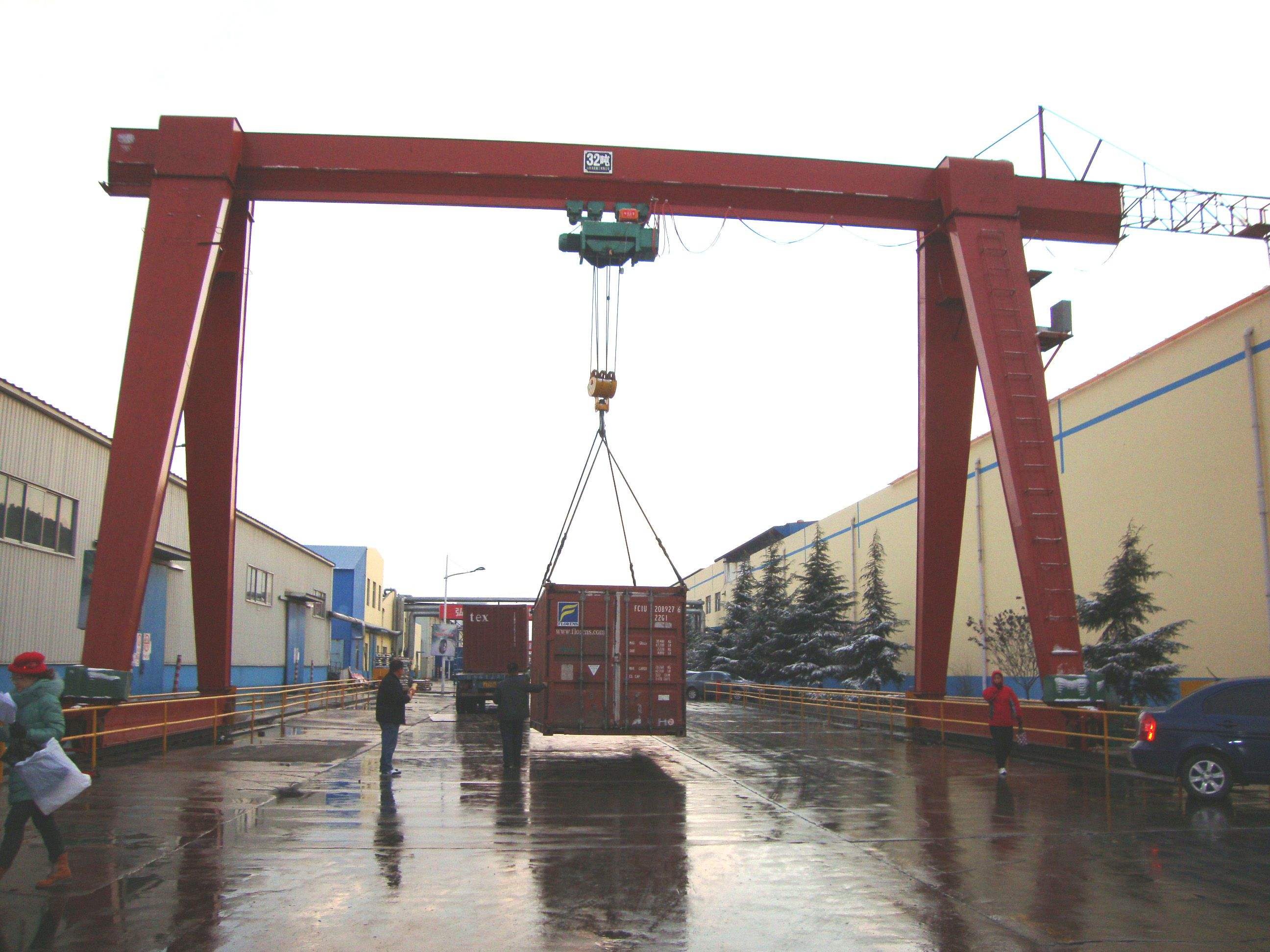 門式起重機(jī)橋式起重機(jī)的一種變形,又叫龍門吊。主要用于室外的貨場(chǎng)、料場(chǎng)貨、散貨的裝卸作業(yè)。它的金屬結(jié)構(gòu)像門形框架,承載主梁下安裝兩條支腳,可以直接在地面的軌道上行走,主梁兩端可以具有外伸懸臂梁。門式起重機(jī)具有場(chǎng)地利用率高、作業(yè)范圍大、適應(yīng)面廣、通用性強(qiáng)等特點(diǎn),在港口貨場(chǎng)得到廣泛使用。